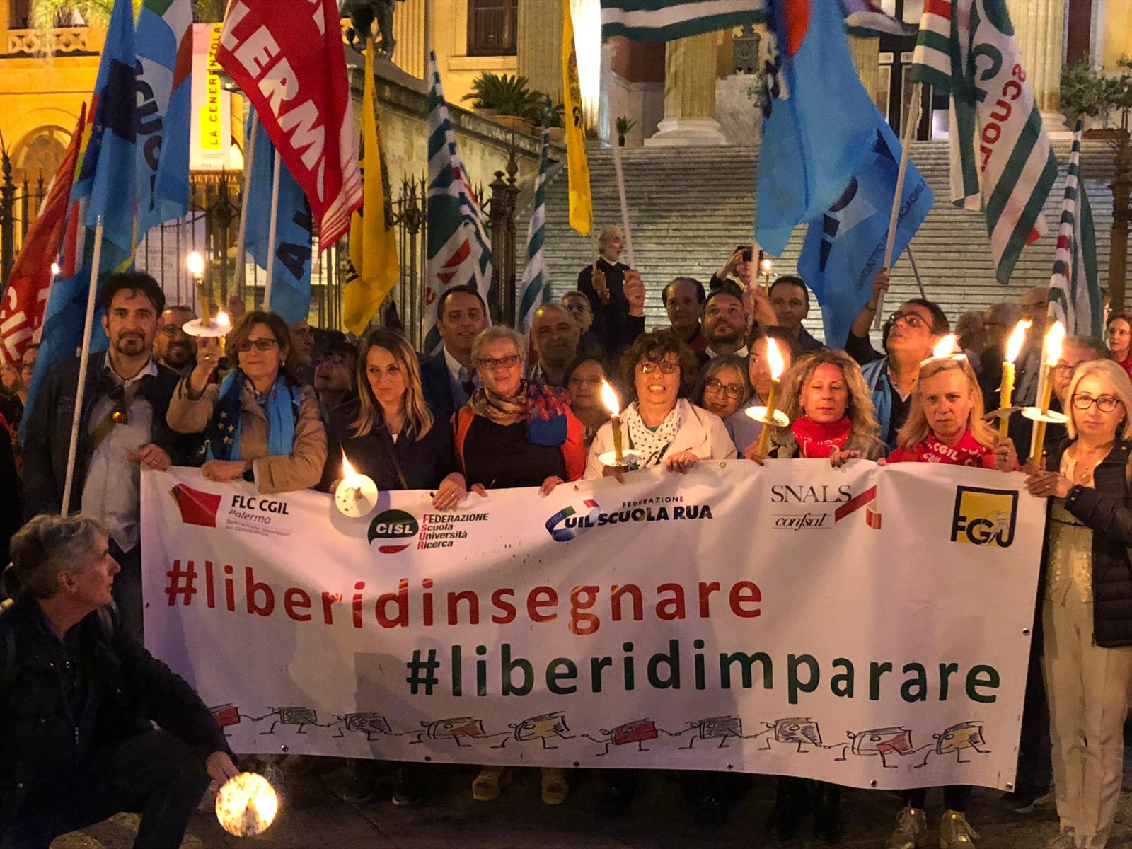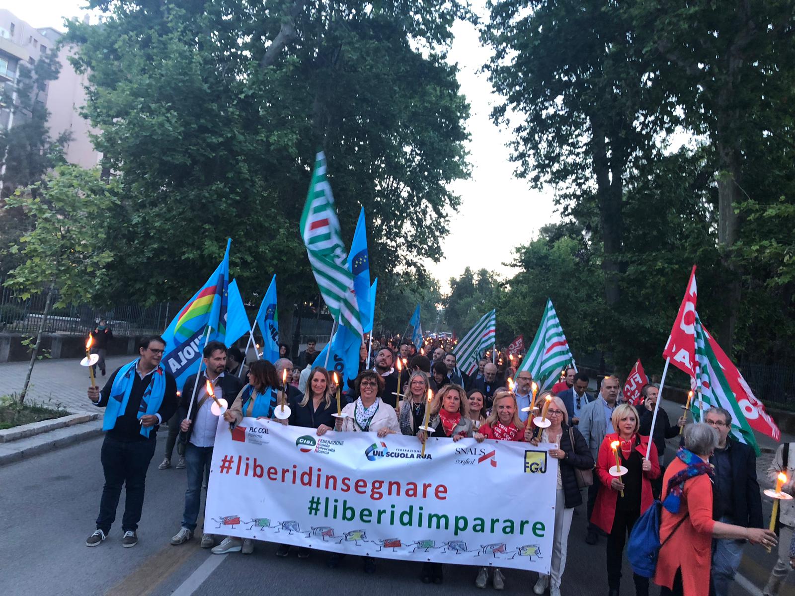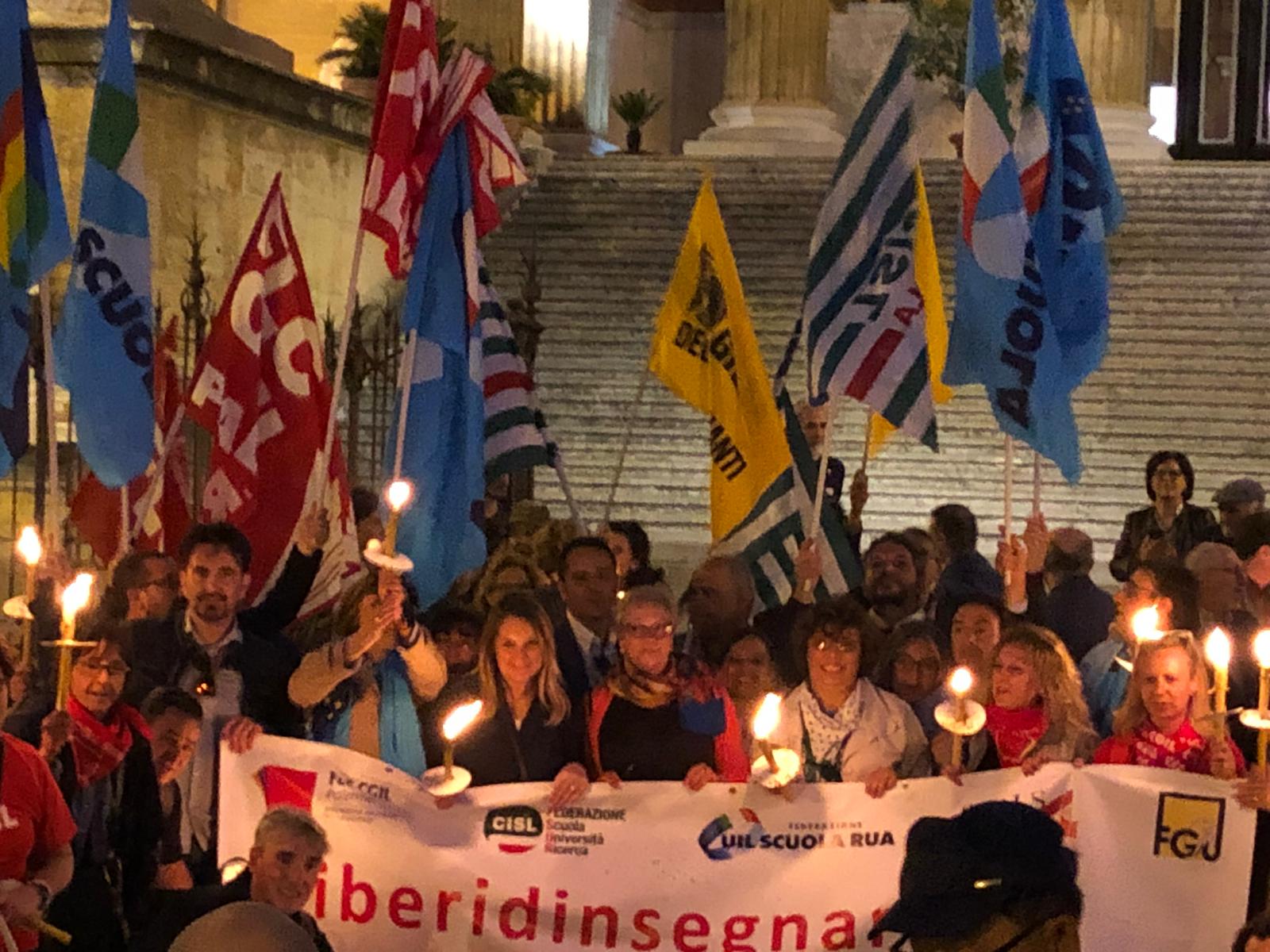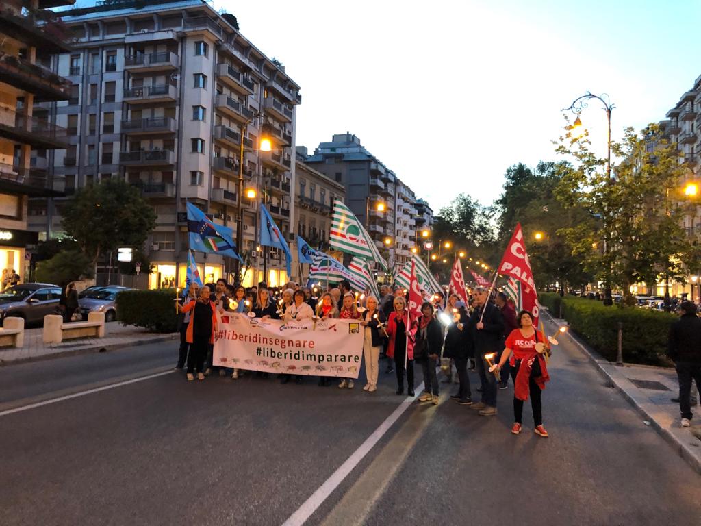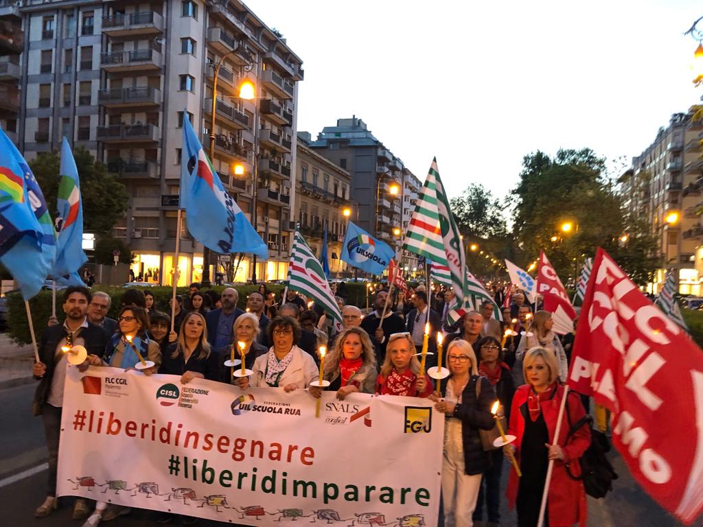 Una Partecipata e ed emozionante assemblea unitaria si è svolta nel pomeriggio del 24 maggio presso L’ITI Vittorio Emanuele III di Palermo, per affermare a gran voce i principi costituzionali della libertà d’insegnamento e della libertà di pensiero. L’ assemblea che ha visto la presenza dei rappresentanti nazionali delle sigle sindacali promotrici, di genitori, studenti e dirigenti scolastici delle scuole di Palermo, è stata animata da interventi di spessore che hanno ribadito la solidarietà all’insegnante Rosellina Dell’Aria punita ingiustamente per aver fatto il suo dovere. Durante l’assemblea e nel corso della fiaccolata – dichiarano i segretari regionali di Flc Cgil Pistorino, Cisl Scuola Bellia, Uil Parasporo , Gilda Lo Re e Snals Romeo, si è respirato un clima emozionante di grande unità, animato dalla consapevolezza di dover difendere fino in fondo alcuni principi fondamentali della scuola della Costituzione, la libertà di insegnamento, la libertà di pensiero e l’unità del sistema scolastico della Repubblica.