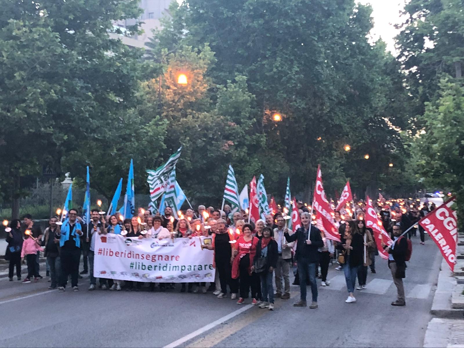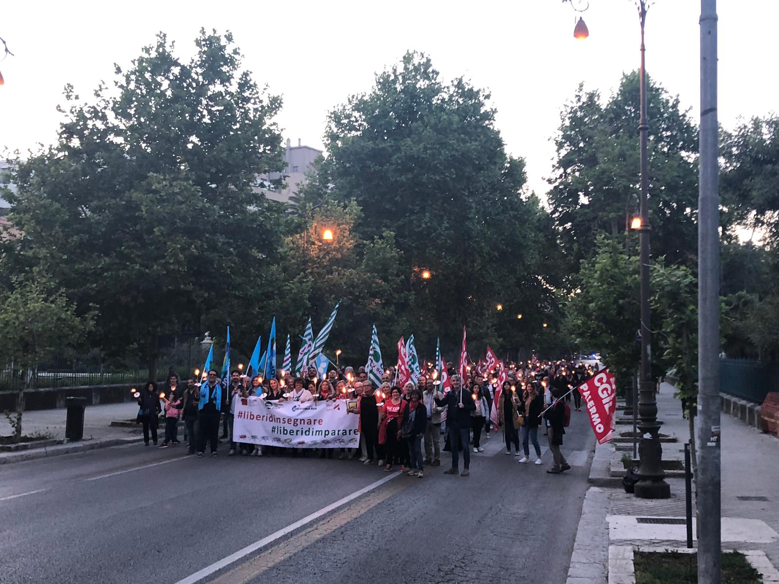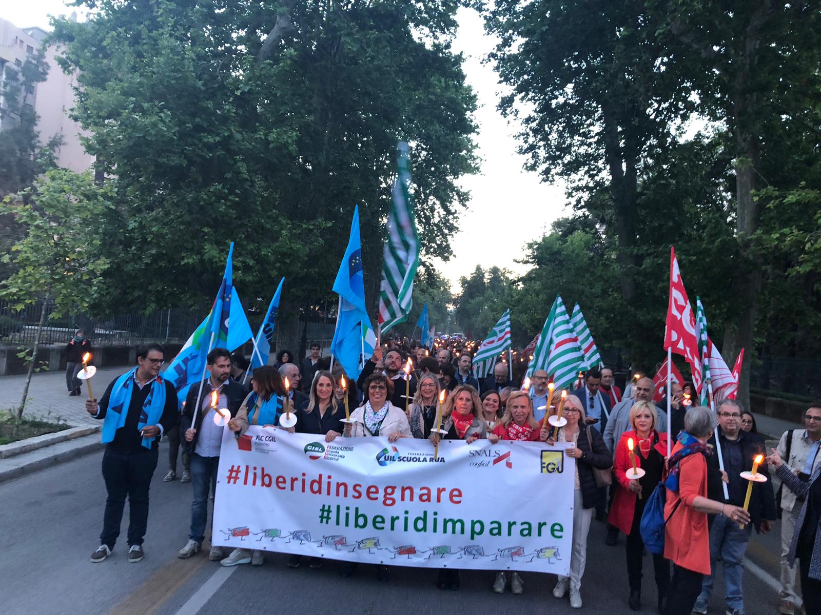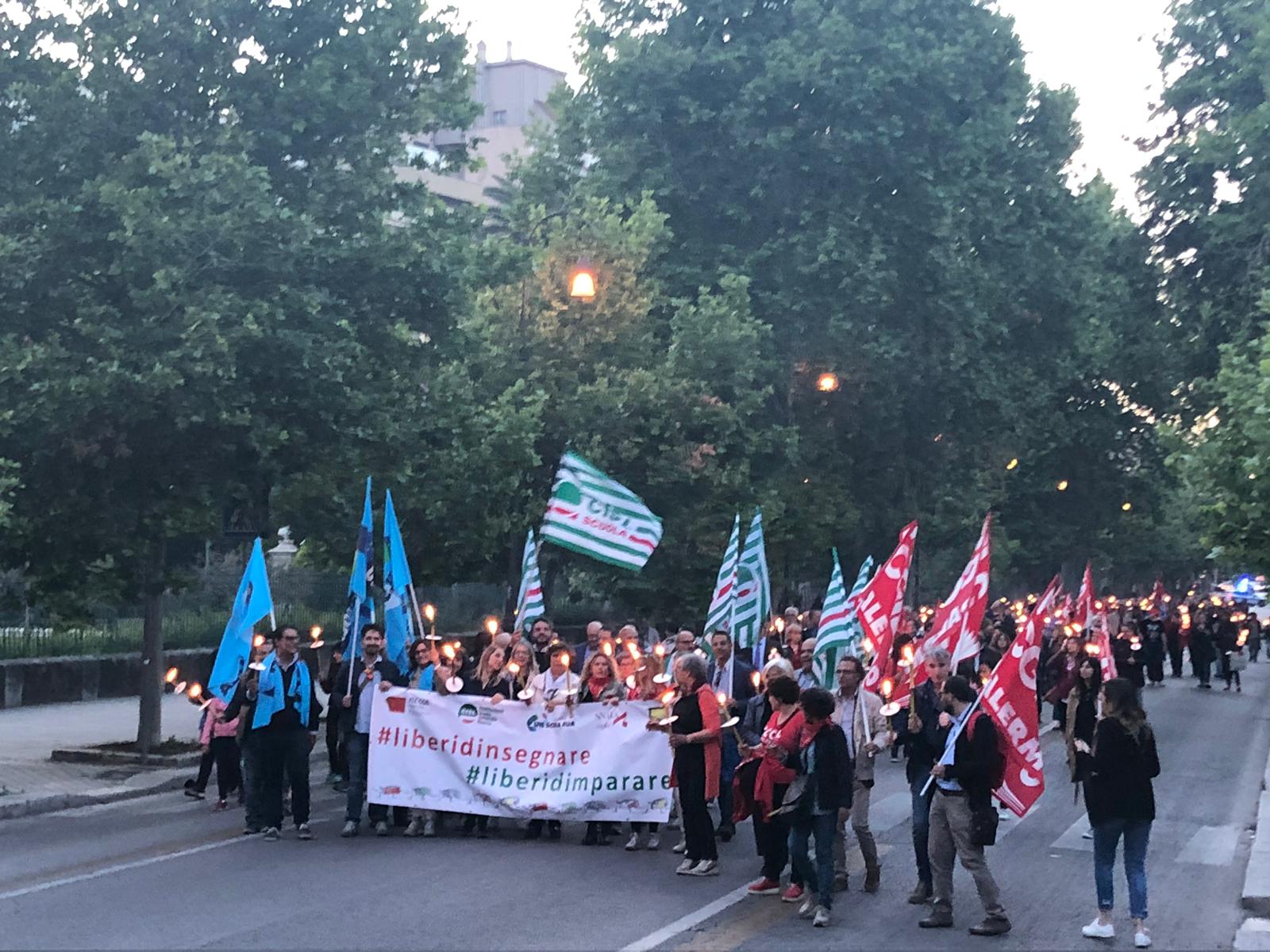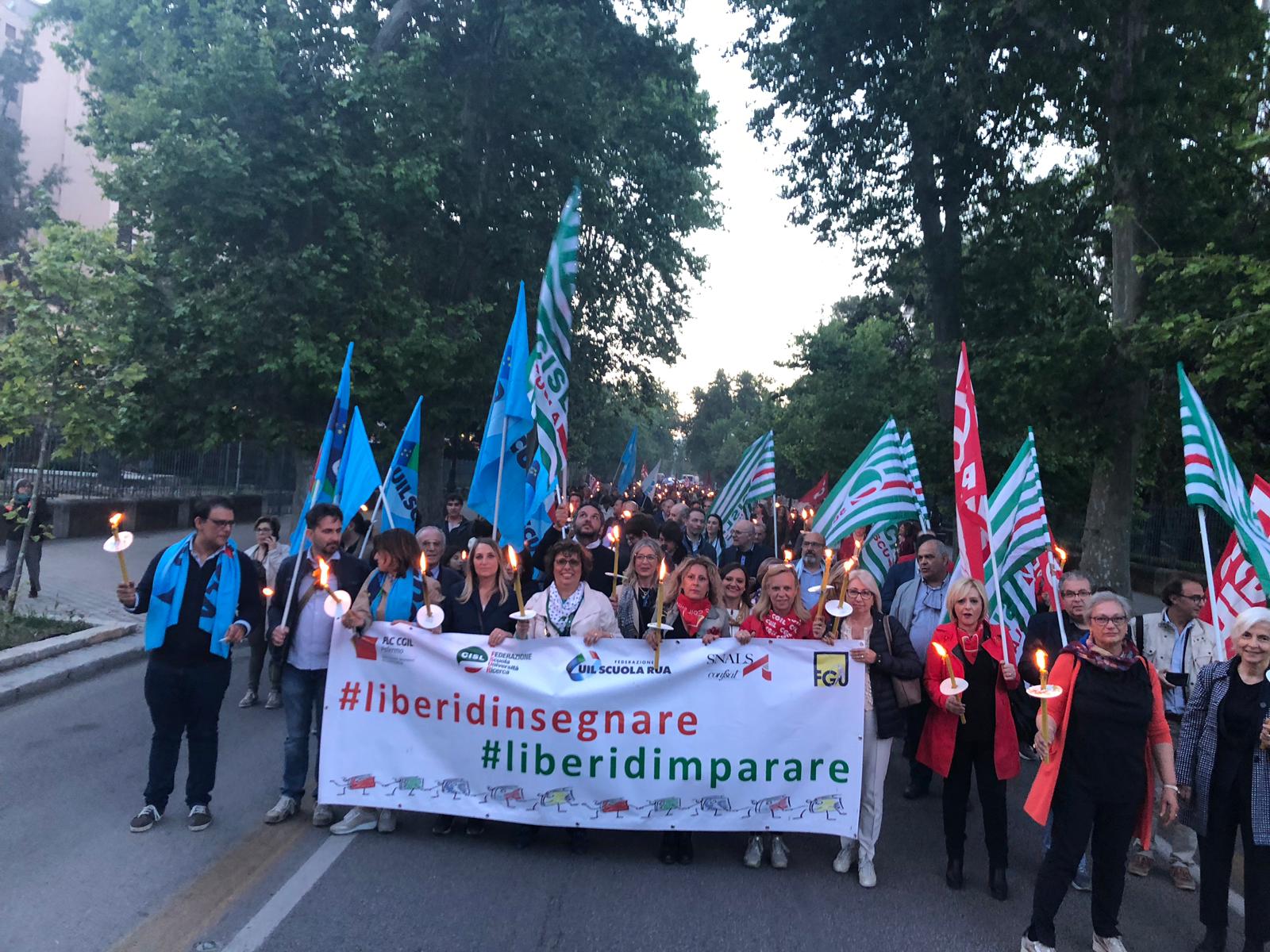 Una Partecipata e ed emozionante assemblea unitaria si è svolta nel pomeriggio del 24 maggio presso L’ITI Vittorio Emanuele III di Palermo, per affermare a gran voce i principi costituzionali della libertà d’insegnamento e della libertà di pensiero. L’ assemblea che ha visto la presenza dei rappresentanti nazionali delle sigle sindacali promotrici, di genitori, studenti e dirigenti scolastici delle scuole di Palermo, è stata animata da interventi di spessore che hanno ribadito la solidarietà all’insegnante Rosellina Dell’Aria punita ingiustamente per aver fatto il suo dovere. Durante l’assemblea e nel corso della fiaccolata – dichiarano i segretari regionali di Flc Cgil Pistorino, Cisl Scuola Bellia, Uil Parasporo , Gilda Lo Re e Snals Romeo, si è respirato un clima emozionante di grande unità, animato dalla consapevolezza di dover difendere fino in fondo alcuni principi fondamentali della scuola della Costituzione, la libertà di insegnamento, la libertà di pensiero e l’unità del sistema scolastico della Repubblica.