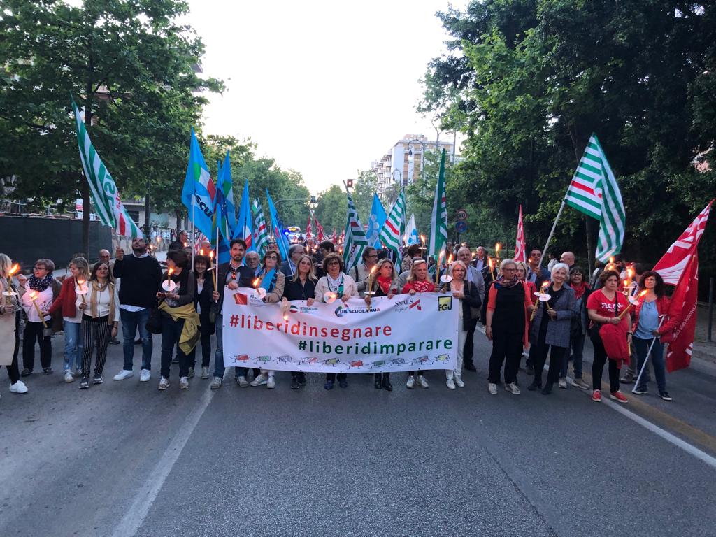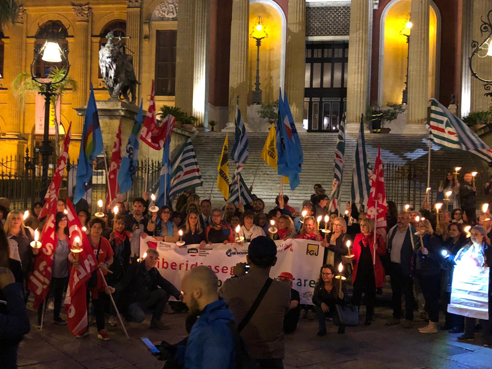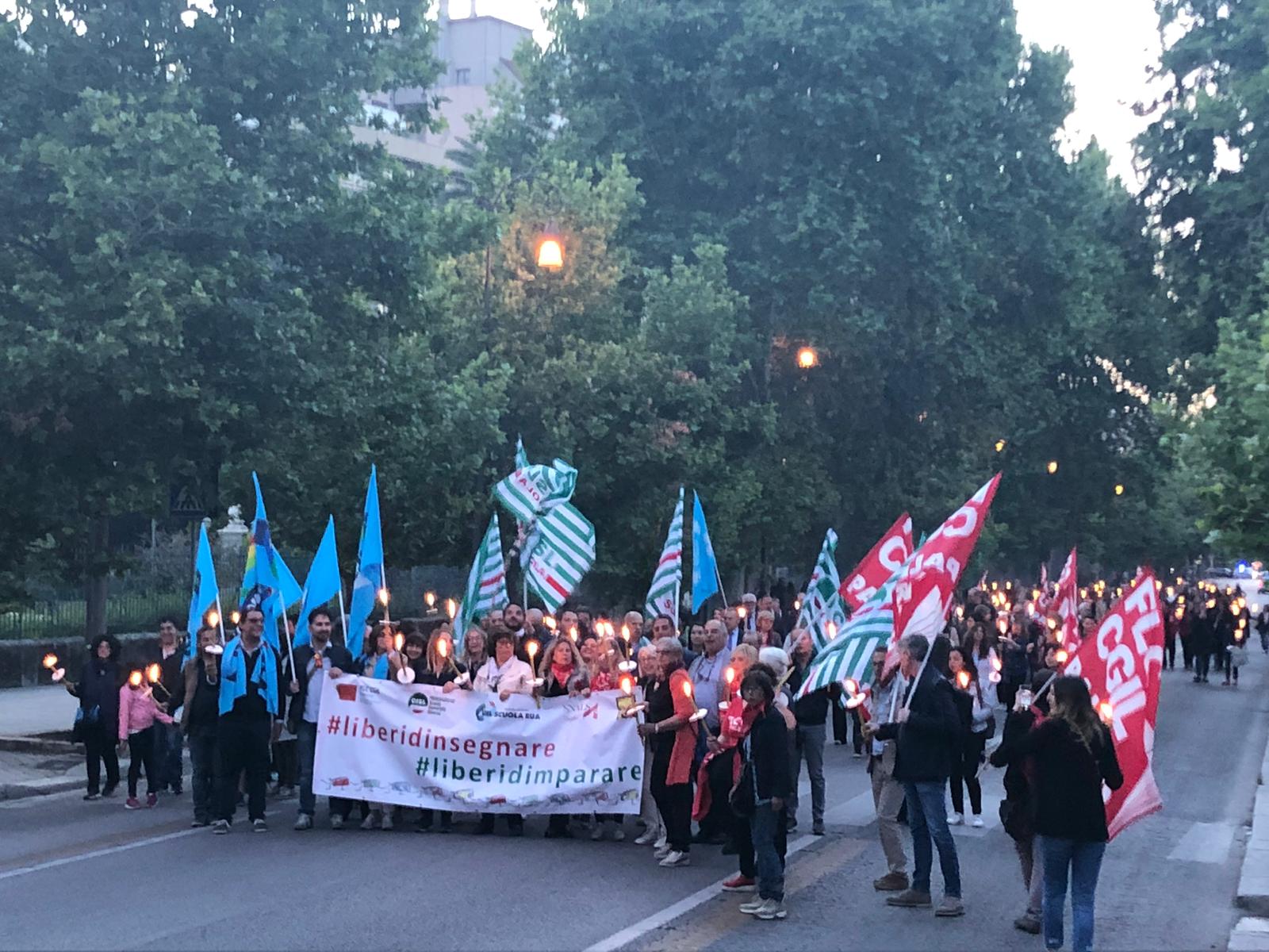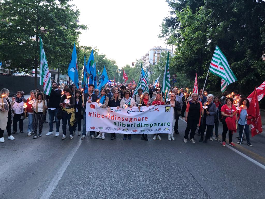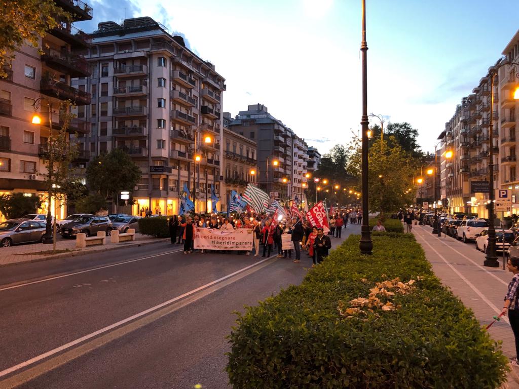 Una Partecipata e ed emozionante assemblea unitaria si è svolta nel pomeriggio del 24 maggio presso L’ITI Vittorio Emanuele III di Palermo, per affermare a gran voce i principi costituzionali della libertà d’insegnamento e della libertà di pensiero. L’ assemblea che ha visto la presenza dei rappresentanti nazionali delle sigle sindacali promotrici, di genitori, studenti e dirigenti scolastici delle scuole di Palermo, è stata animata da interventi di spessore che hanno ribadito la solidarietà all’insegnante Rosellina Dell’Aria punita ingiustamente per aver fatto il suo dovere. Durante l’assemblea e nel corso della fiaccolata – dichiarano i segretari regionali di Flc Cgil Pistorino, Cisl Scuola Bellia, Uil Parasporo , Gilda Lo Re e Snals Romeo, si è respirato un clima emozionante di grande unità, animato dalla consapevolezza di dover difendere fino in fondo alcuni principi fondamentali della scuola della Costituzione, la libertà di insegnamento, la libertà di pensiero e l’unità del sistema scolastico della Repubblica.